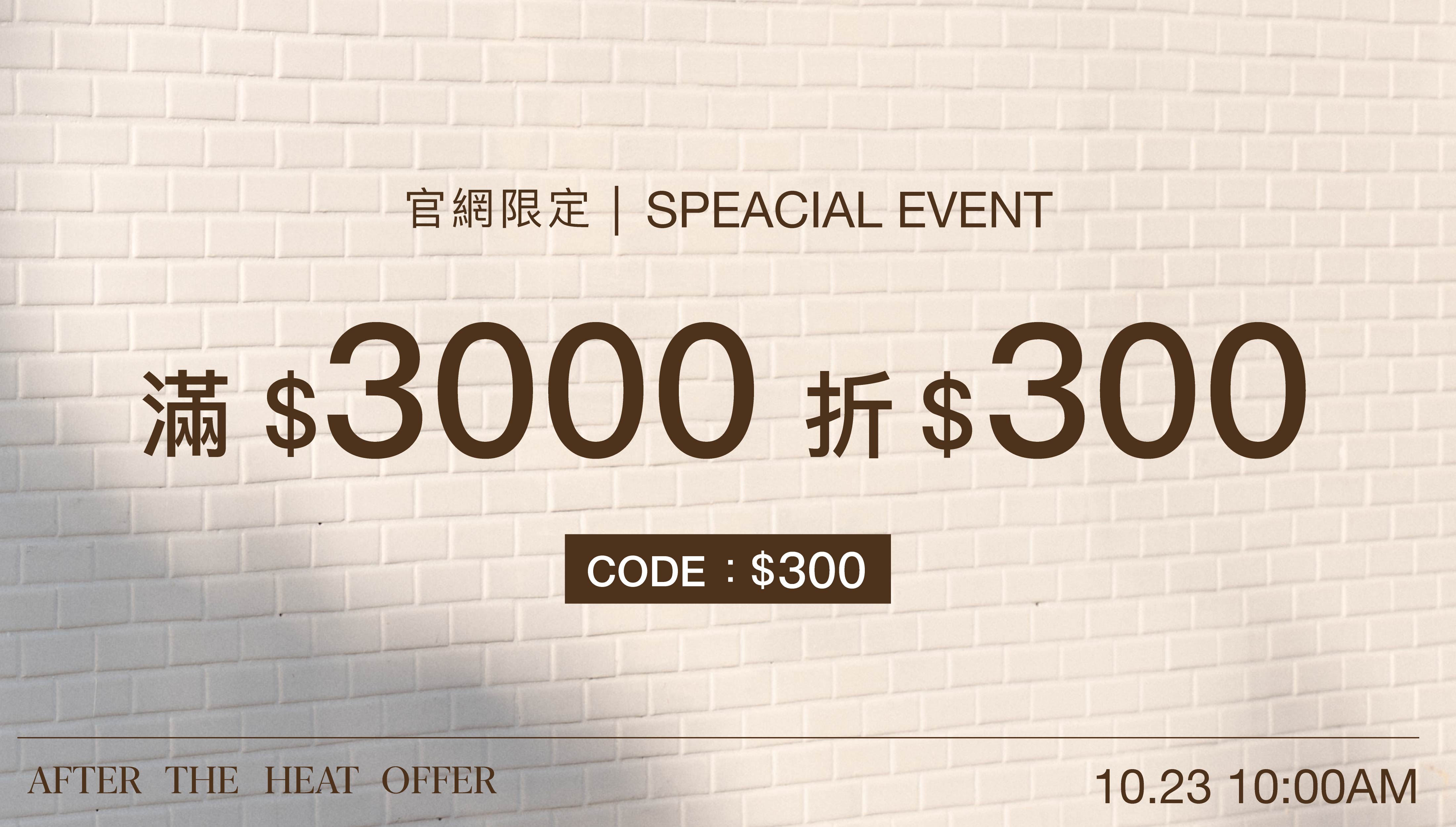單筆滿$3,000元以上,輸入代碼【$300】即可享300元折扣優惠。(若為VIP/VVIP會員,則以折扣後的消費金額計算。)