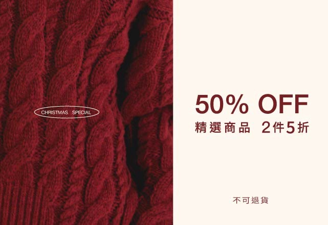 指定專區內"任選2件不同商品"加入購物車,由系統自動變價為5折,不同價格不同款式皆可配對。(不納入會員折扣及無提供退換貨服務。)