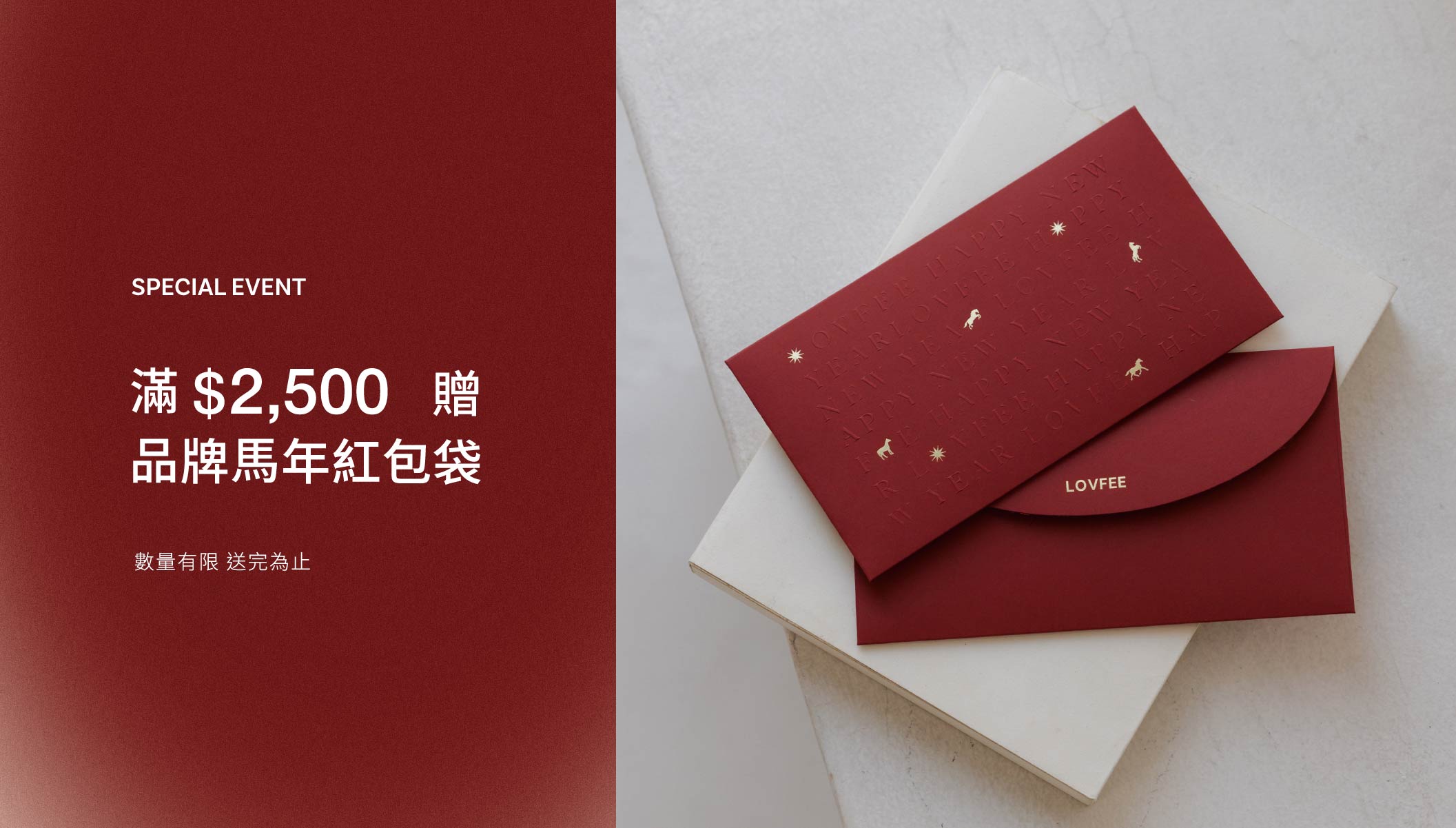 全館單筆消費滿額 NT$2,500 元,即隨機獲贈『LOVFEE紅包袋』乙組(兩入)。